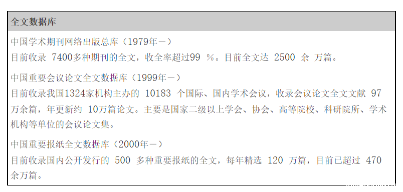 “中国基础设施工程(National Knowledge Infrastructure,CNKI)”,收录资源包括期刊、博硕士论文、会议论文、报纸等学术与专业资料;覆盖理工、社会科学、电子信息技术、农业、医学等广泛学科范围,数据每日更新,支持跨库检索。目前读者可访问的主要数据库有:中国学术期刊网络出版总库、中国重要会议论文全文数据库、中国重要报纸全文数据库。